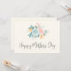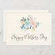 Tarjeta del Día de la Madre con una bonita ilustración de acuarela. Un ramo de flores con flores rosas y azules rodeadas de hojas verdes y ramitas.