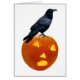 Un cuervo se sienta en una linterna encendida en esta tarjeta de Halloween.