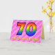 Esta feliz y divertida tarjeta de felicitación de cumpleaños número 70 tiene un frente con un gran número "70" que tiene un colorido patrón de gradiente inspirado en el espectro de arcoiris, sobre un alegre fondo de rayas de color rosa oscuro y rosa claro. En la parte delantera también aparece el mensaje "Feliz cumpleaños número 70", seguido de un nombre editable del destinatario. El interior presenta un mensaje de bienvenida de cumpleaños personalizado, o tal vez podría ser borrado y dejado en blanco si se va a escribir un mensaje a mano. Una tarjeta de cumpleaños personalizada como esta podría ser una manera divertida y feliz de enviar un mensaje para celebrar el septuagésimo cumpleaños de alguien. [~Z0000418]