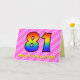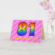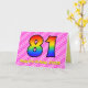 Esta divertida y animada tarjeta de felicitación de 81 años tiene un frente con un gran número "81" que tiene un patrón colorido inspirado en la apariencia de un espectro arcoiris, en un divertido corazón rosa claro y rosa oscuro formas rayas fondo patrón. En la parte delantera también aparece el mensaje "Feliz cumpleaños 81", seguido de un nombre de destinatario de personalizable. El interior presenta un mensaje de bienvenida de cumpleaños personalizado, o tal vez podría ser borrado y dejado en blanco si se va a escribir un mensaje a mano. Una tarjeta de personalizable como esta puede ser una manera divertida y feliz de enviar deseos de cumpleaños a alguien que está celebrando su 81º cumpleaños. [~Z0000418]