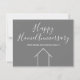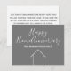 Esta moderna tarjeta Happy Home Aniversario está hecha personalizado con el nombre de su compañía de propiedades bajo la tipografía de la moda. Estas minimalistas tarjetas grises y blancas tienen un sencillo dibujo de una casa. Son perfectas para enviar a clientes que han comprado su casa para recordarles que deben consultar a amigos y familiares que buscan comprar o vender su casa. El marketing de negocios de bienes raíces significa llegar a clientes repetidos y pedir sus remisiones.