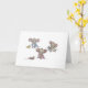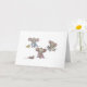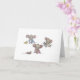 Esta tarjeta, para dar la bienvenida a un recién nacido, tiene tres ratones bebé. Un pequeño ratón con un durmiente azul sostiene una botella y está siendo observado por un pato. Un ratón con pañal tiene un peluche azul. Y, un ratón de rosa sostiene un pato de juguete mientras que un ratón aún más pequeño mira. En blanco dentro para que puedas