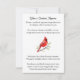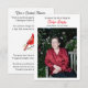 Una tarjeta personalizada a la que puedes agregar la foto, el nombre y las fechas de nacimiento y fallecimiento de una persona. En el reverso hay un poema sobre los cardenales que vienen a visitarte cuando un ser querido está cerca, haciéndote saber que nunca se pierden. Tiene algunos acentos rojos para que coincida con el cardenal. Estas son bonitas para poner en mesas en celebraciones o funerales para que la familia y amigos del ser querido se las lleven a casa.