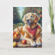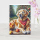 Un perro recuperador de oro con una bandana roja se sienta al lado de una canasta de mimbre de manzanas en un huerto Todo el texto puede ser cambiado.