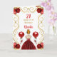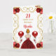 Esta invitación a la tarjeta de cumpleaños incluye un marco dorado elegante, una bella princesa con el pelo rojo y un vestido rojo, flores y un globo.