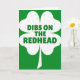 This card features a large white four-leaf clover centered on an emerald green background, giving it a classic St. Patrick’s Day look ☘️. Inside the clover, the phrase “DIBS ON THE REDHEAD” appears in dark green, set in a sturdy sans-serif style that stands out clearly against the white. The words are stacked in three lines and centered within the clover’s rounded leaves, like a cheeky claim meant to make a friend laugh or catch a partner’s eye 💚. The simple layout feels like a lighthearted toast at a crowded pub, where someone leans in close and says it with a grin. Both the green backdrop and the white clover have a speckled, worn texture that adds depth and a slightly vintage, screen-printed feel. Tiny darker flecks scatter across the white clover while lighter breaks and grain soften the solid green field. The clover’s stem points downward from the center, and the roughened edges and scattered speckles give the whole design a gently weathered finish.