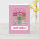 Esta es una tarjeta de cumpleaños con un regalo de cumpleaños creado con un aplicador de nueve bloques de revisión usando un costado zig zag. El fondo son puntos de polka y el texto dice, ‘Feliz cumpleaños’.