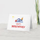 Esta tarjeta representa a un nadador que lleva un gorra fiesta y un regalo. Hay tres estrellas amarillas en el fondo y el saludo en rojo en el frente es "FELIZ CUMPLEAÑOS". En el interior, hay una nueva parcela estrellada. El mensaje está listo para personalizar, y dice "¡Esperando que tu cumpleaños vaya a nadar!"