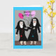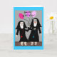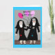 Tarjeta católica de cumpleaños, tazas, bolsas de té, carteles y botones. Dos monjas, una con globos rosados. ¡Adorable!