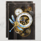 Diales antiguos con artes de oro y latón, decorados con libélula mecánica sobre fondo marrón, rayado. Steampunk.