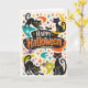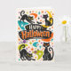 A bold, playful Halloween illustration bursting with mid-century modern charm. Four stylized black cats strike mischievous poses around a dramatic “Happy Halloween” banner, their bright eyes glowing in yellow, orange, and purple. The composition is energized by atomic-age starbursts, crescent moons, dots, and swooping shapes in a lively palette of teal, chartreuse, orange, violet, and black. With its clean style, whimsical motion, and retro-futuristic flair, this design feels fun, festive, and delightfully kitschy.