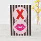 This design shows a tall figure-eight shape running down the center of the card. In the top loop, there’s a strong red “X” that looks crisp and simple. In the bottom loop, a pair of hot pink lips sit slightly open, with small white highlights that make them look glossy. A pale pink outline traces the center shape, and behind it are vertical stripes that alternate black and creamy beige. The whole image has a pixel-like texture, like you’re seeing it on a screen, which gives it a modern, digital feel. There isn’t any other written message on the front besides the red “X,” placed in the upper section. It feels meaningful because it captures that mix of being nervous to speak up and still wanting to show affection, which can be very real in love or friendship 🥰❤️. Hope it helps you share your Valentine’s Day sentiments.