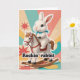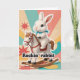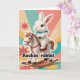 A card for numerous occasions. A white rabbit rides upon a nursery wooden rocking horse.