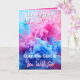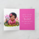Tarjeta de revelación de género para familia y amigos. ¿Qué será? ¿Un niño o un chica? Humo rosa o azul en la parte delantera. Adentro está, "Es un chica, debe estar (llena la fecha)" Y una foto de una bebé afroamericana.