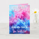 Tarjeta de revelación de género para familia y amigos. ¿Qué será? ¿Un niño o un chica? Humo rosa o azul en la parte delantera. Adentro está, "Es un chica, debe estar (llena la fecha)" Y una foto de una niña caucásica.
