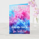 Tarjeta de revelación de género para familia y amigos. ¿Qué será? ¿Un niño o un chica? Humo rosa o azul en la parte delantera. Adentro está, "Es un niño, debe estar (llena la cita)" Y una foto de un niño asiático.
