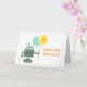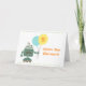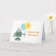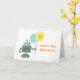 Envíe sus deseos del cumpleaños al muchacho del cumpleaños con esta postal linda del saludo que tenga un dibujo animado de un robot verde feliz en las ruedas. El robot se está aferrando a los globos azules y amarillos. Modelo de puntos para las decoraciones de la frontera. ¡Diseño colorido y adorable para los niños que aman la ciencia ficción o los juguetes del robot!