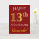 Este diseño de tarjeta de felicitación de aniversario de boda simple y personalizado presenta el mensaje "FELIZ 13º ANIVERSARIO", con el "13º" teniendo una apariencia similar al oro. La parte delantera también presenta un nombre personalizado y un fondo de color rojo. El interior presenta un mensaje de felicitación de aniversario de boda personalizado. Se podría dar a un esposo o una esposa en celebración del decimotercer aniversario de bodas de la pareja.