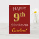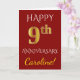 Este diseño simple y personalizado de tarjeta de felicitación de aniversario de boda presenta el mensaje "FELIZ 9º ANIVERSARIO", con el "9º" teniendo una apariencia similar al oro falso. La parte delantera también presenta un nombre personalizado y un fondo de color rojo. El interior presenta un mensaje de felicitación de aniversario de boda personalizado. Podría darse a un esposo o una esposa en celebración del noveno aniversario de boda de la pareja. [~Z0000078]