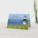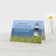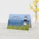 La inspiradora tarjeta de saludo personalizado representa un faro blanco y negro con flores amarillas de bonito y un fondo azul oceánico y celeste y presenta la Biblia Verse Romans 15:13, "Que el Dios de la esperanza te llene de toda alegría y paz como confías en él, para que puedas desbordarte con esperanza por el poder del Espíritu Santo".