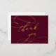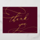Esta romántica tarjeta de agradecimiento de Relieve metalizado dorado y burdeos es perfecta para un boda sencillo. El moderno diseño clásico presenta vistosos remolinos y florituras con una magnífica y elegante tipografía con letras a mano en lujoso Relieve metalizado dorado prensado. La parte posterior está en blanco para que puedas escribir a mano un mensaje personal. Estas tarjetas se pueden usar para un boda, una ducha de novia o cualquier evento especial.