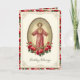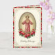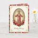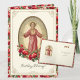 Con una hermosa imagen católica vintage del Sagrado Corazón de Jesús con un borde de rosas rojas. Dentro hay un versículo de la escritura y un saludo.