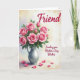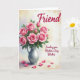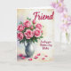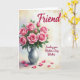 Designed with a generous bouquet of pink roses gathered in a silver-toned pitcher, the artwork places the flowers high in the center so your eye lingers on each curled petal. The blossoms range from tight buds to fully open blooms in shades of blush and fuchsia, and the soft spirals of the petals feel like a quiet exchange of affection ❤️. Deep green leaves fill out the arrangement, adding contrast and a cozy, cared-for look. Under the pitcher, a pale tabletop holds scattered pink petals, like a gentle trace left behind after a sweet moment shared. The background washes together light yellow, peach, and faint lavender tones, giving the whole scene a warm, airy glow. Text reading “Friend” sits near the top in a dark, flowing style, while “Sending you Mother’s Day Wishes” appears in the lower right in matching dark lettering 🌼. The pitcher has a subtle metallic shine along its curved side, and several loose petals rest near the base on the light surface.