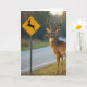 Un dólar se para en alerta al lado de un letrero de carretera, que irónicamente muestra un venado saltando, al lado de una calle tranquila que se extiende a través de una zona boscosa. Se puede cambiar el texto interior.