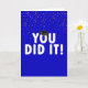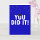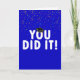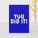 Brillante cartel azul de "lo hiciste" con una gorra negra de graduación y un colorido confeti de fondo azul.