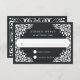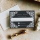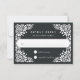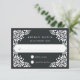 Diseñada para coordinar con nuestra colección de bodas de Bellas Artes, esta elegante tarjeta RSVP presenta un borde blanco de estilo de picado que enmarca la fecha de respuesta deseada y la redacción de aceptación y rechazo personalizado, sobre un rico fondo carbón vegetal negro.