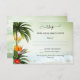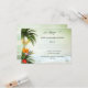 Una elegante tarjeta RSVP de boda con una exótica escena de playa costera con palmeras, farolillos y flores de colores. Esta tarjeta RSVP forma parte de una colección de bodas con productos coincidentes.