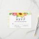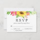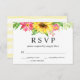 Tarjeta RSVP de boda de girasol con opción de número de asistencia. La tarjeta está decorada con un bonito ramo de girasoles en cascada en la parte superior de la tarjeta. La parte trasera de la tarjeta está decorada con suaves rayas de color amarillo.