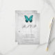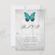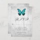 Elegante y simple tarjeta de respuesta Boda con una mariposa verde azulada sobre un fondo gris. Este moderno diseño es una elección única para un boda moderno. Fácil de personalizar con los detalles de su boda. Haga clic en "Personalizar" para encontrar más opciones de personalización.