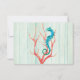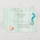 Bonita carta de respuesta boda temática de playa, con un verde espuma de mar en el fondo de la madera. La tarjeta está decorada con gráficos de un caballo de mar turquesa y una concha. Personaliza todo el texto para tu boda en la playa. Hay invitaciones y otros productos disponibles.