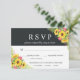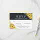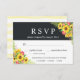 Tarjeta RSVP de boda girasol con opción de cena y número de asistencia. La carta está decorada con un ramo de girasol en las esquinas superior derecha e inferior izquierda. La parte trasera de la tarjeta está decorada con suaves rayas de color amarillo.