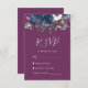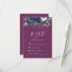 El borde superior de esta romántica tarjeta de recinto RSVP para bodas incluye un ramo acuarela floral de ciruela morada y azul marino y vegetación. El título "RSVP" aparece en escritura a mano, con el texto de personalizable debajo en blanco sobre fondo de ciruela. El reverso es un sólido color de ciruela que coordina