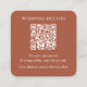 Administre su RSVP fácilmente con la ayuda de esta tarjeta RSVP de terracota. Al escribir en el sitio web de su boda, se generará automáticamente un código QR para usted, lo que permitirá a los huéspedes acceder a RSVP en línea y mantenerse al día con todos los detalles de su boda. Perfecto para una boda moderna en otoño, sobre todo una de temática mexicana o suroeste. Vea la completa Colección de Bodas de Cotta de Terra Mexicana para artículos más perfectamente coordinados para su día especial.