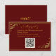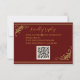 Esta tarjeta RSVP es una elegante extensión de la opulencia de la invitación principal. La parte delantera muestra un lienzo rojo real profundo, detallado con un filigrí grabado en relieve dorado, enmarcando un espacio para un código QR que aparece de forma destacada. Este toque moderno se integra perfectamente en el diseño ornamental, ofreciendo a los huéspedes una forma conveniente de responder preservando al mismo tiempo la elegancia clásica de la tarjeta. La parte posterior revela un espacio para un monograma de personalizable y fecha boda, envuelto en delicados rollos de oro. La fibra hace eco del motivo del frente, creando un diseño bellamente cohesivo que se siente a la vez personal y atemporal. La interacción del oro brillante en rojo rico ofrece un tono audaz y refinado, ideal para una celebración enraizada en el romance y la sofisticación.
