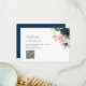 Una tarjeta boda RSVP de código QR con letras negras simples, flores color de agua azul marino y azul cielo.