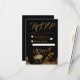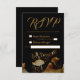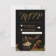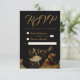 Elegante tarjeta RSVP de boda con temática de máscaras en negro y oro. Personalice con su propia fecha y texto personalizar para hacerlo propio.