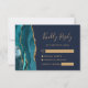 El borde izquierdo de esta elegante y moderna tarjeta de recinto RSVP para bodas cuenta con una verde azulada barra acuática recortada con un falso purpurina de oro. El título "Kindly Reply" aparece en la escritura a mano, con el texto de personalizable debajo en una fuente de placa de cobre de color oro sobre un sofisticado fondo azul marino. El reverso presenta un diseño de agate verde azulado y dorado a juego.