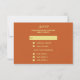 Añada un toque elegante a sus invitados de boda con esta tarjeta de respuesta RSVP de boda de terracota y oro. La parte delantera incluye un diseño rosa junto con "Save the Date" (Guardar la fecha), el nombre de la pareja y la fecha de la ceremonia del boda. Los detalles de la respuesta están en la parte de atrás, incluyendo el plazo para el RSVP y la selección de opciones de comida. Utilice la plantilla para personalizar.
