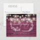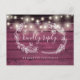 Una carta rústica RSVP con luces de cuerda de bonito, guirnaldas florales dibujadas a mano y tipografía de moda en un fondo de paneles de madera roja borgoñona. El reverso cuenta con tus detalles y una divertida petición de canciones de invitados. Diseñado por Thisisnotme©