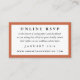 El tipo clásico y un marco elegante de una rica terracota naranja-roja le dan a esta tarjeta de solicitud RSVP la versatilidad para integrarse con todo tipo de invitaciones, sólo tiene que ajustar el color de fondo para que coincida con los colores de tu evento. No olvide personalizar la respuesta por fecha y el texto de la URL del sitio web de esta tarjeta de inserción de RSVP en línea y dirigir a su invitado a su sitio web boda todo mientras ahorra algunos árboles y dinero en el envío.