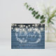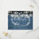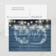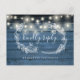 Una carta rústica RSVP con luces de cuerda de bonito, guirnaldas florales de mano y tipografía de moda en un fondo de paneles de madera azul. El reverso cuenta con tus detalles y una divertida petición de canciones de invitados. Diseñado por Thisisnotme©