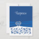 Esta romántica tarjeta RSVP de boda floral azul y blanco real con opciones de comida tiene una imagen de un corazón de fibra azul plateado y real encima de una imagen de cinta azul real que cruza la parte inferior de la tarjeta de respuesta con flores azules sobre un fondo blanco debajo de la cinta y la palabra "Respuesta" en un gran guión blanco sobre un fondo azul encima de la cinta. El fondo tiene un fondo azul y blanco real con los detalles de tu RSVP y las selecciones de comidas impresas en dos tonos de azul real con un corazón azul real en la parte superior y un marco de desplazamiento alrededor de la redacción. Si necesita algún elemento adicional coincidente, envíe su solicitud a niteowlstudio@gmail.com o utilice la función de chat Zazzle para ponerse en contacto.