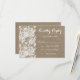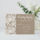 Rústica tarjeta RSVP con burlap y encaje para boda. Decorada con un encaje floral blanco sobre un fondo burlap marrón. Puede personalizar de todo el texto y los tipos de letra, incluidas las líneas de respuesta.