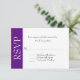 Elegante tarjeta de respuesta RSVP para eventos / bodas hecha en blanco, en la parte delantera, con una franja violeta, en el lado izquierdo, con texto blanco grande que lee RSVP. La parte posterior de la tarjeta es púrpura sólido. Todo el texto está listo para personalizar su evento.