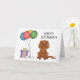 Diseño temático de cumpleaños con el original ilustracion personalizado de Destei de un lindo color de rubí Cavalier Rey Carlos español perro de raza. Al lado del perro hay globos de cumpleaños coloridos atados sobre un hueso de perro y una caja de regalo de color morado y amarillo. El fondo está decorado en tonos pastel y con un fondo blanco. También hay un área de texto personalizable que ahora dice: "¡Feliz cumpleaños!".