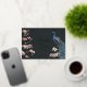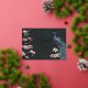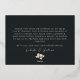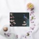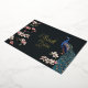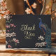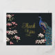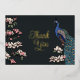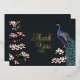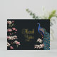 Esta Rustic Black and Gold Peacock Thank You Card incluye un moderno pavo real azul/verde azulado de estilo Chinoiserie encaramado en un árbol de magnolia en flor. En la parte posterior aparece el mensaje de agradecimiento personal y los nombres de novia y Groom. Elegante fondo casi negro.